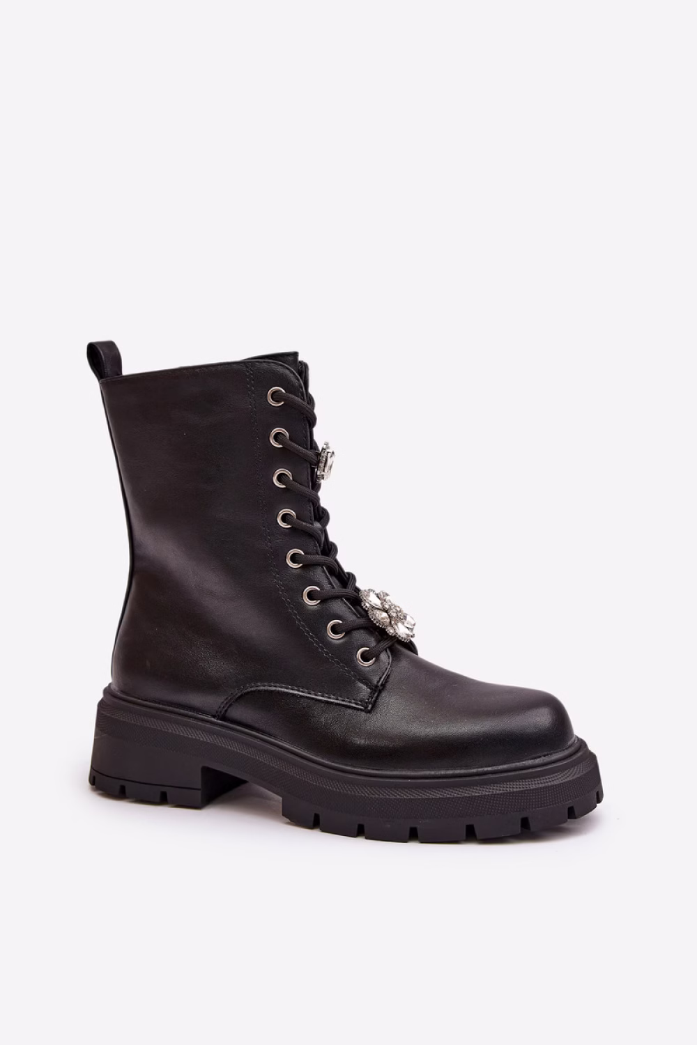 Botine pentru femei realizate din piele ecologică, care combină stilul cu confortul. Așezate pe un toc plat, cu vârfuri rotunjite, oferă confort pentru uzura zilnică. Modelul se închide cu fermoar lateral pentru a fi ușor de încălțat, iar șireturile suplimentare cu broșe drăguțe le conferă un farmec aparte. Ideale pentru stilizările de toamnă și iarnă, se potrivesc perfect cu diferite seturi pentru zilele mai reci.